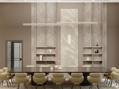 This modern majlis and dining room is designed around a monochrome palette and a clean, refined minimalism. The space prioritizes balance, openness and visual calm, using soft tonal variations instead of heavy color to create depth.
